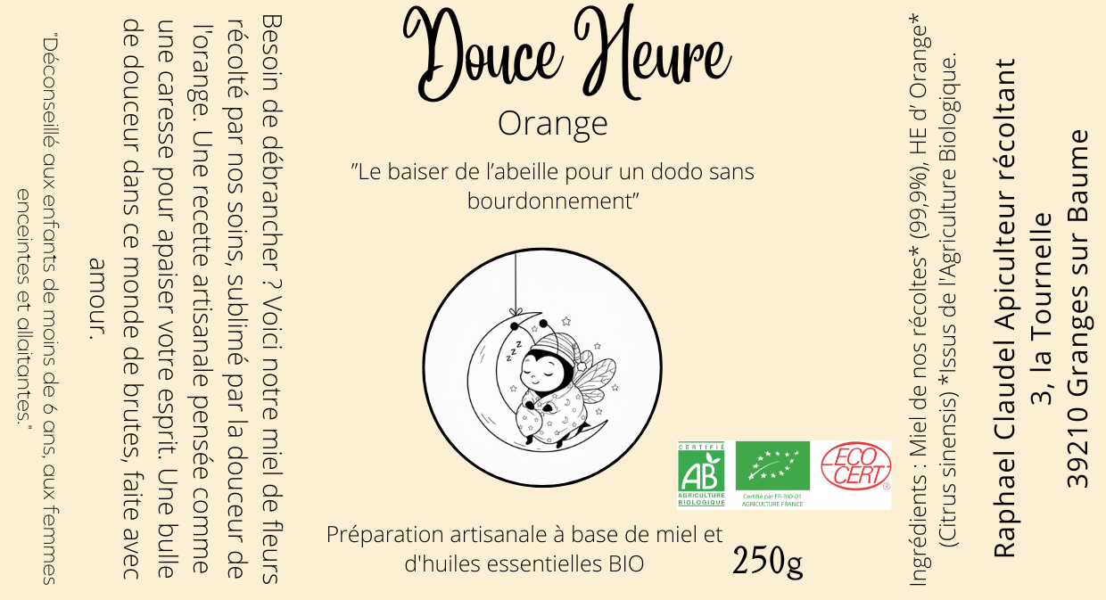 L’alliance de la ruche et de l’aromathérapie Cette préparation est conçue pour accompagner vos moments de détente. Nous utilisons un miel toutes fleurs certifié biologique, récolté dans le Jura, pour servir de base à l’huile essentielle d’Orange douce (Citrus sinensis).